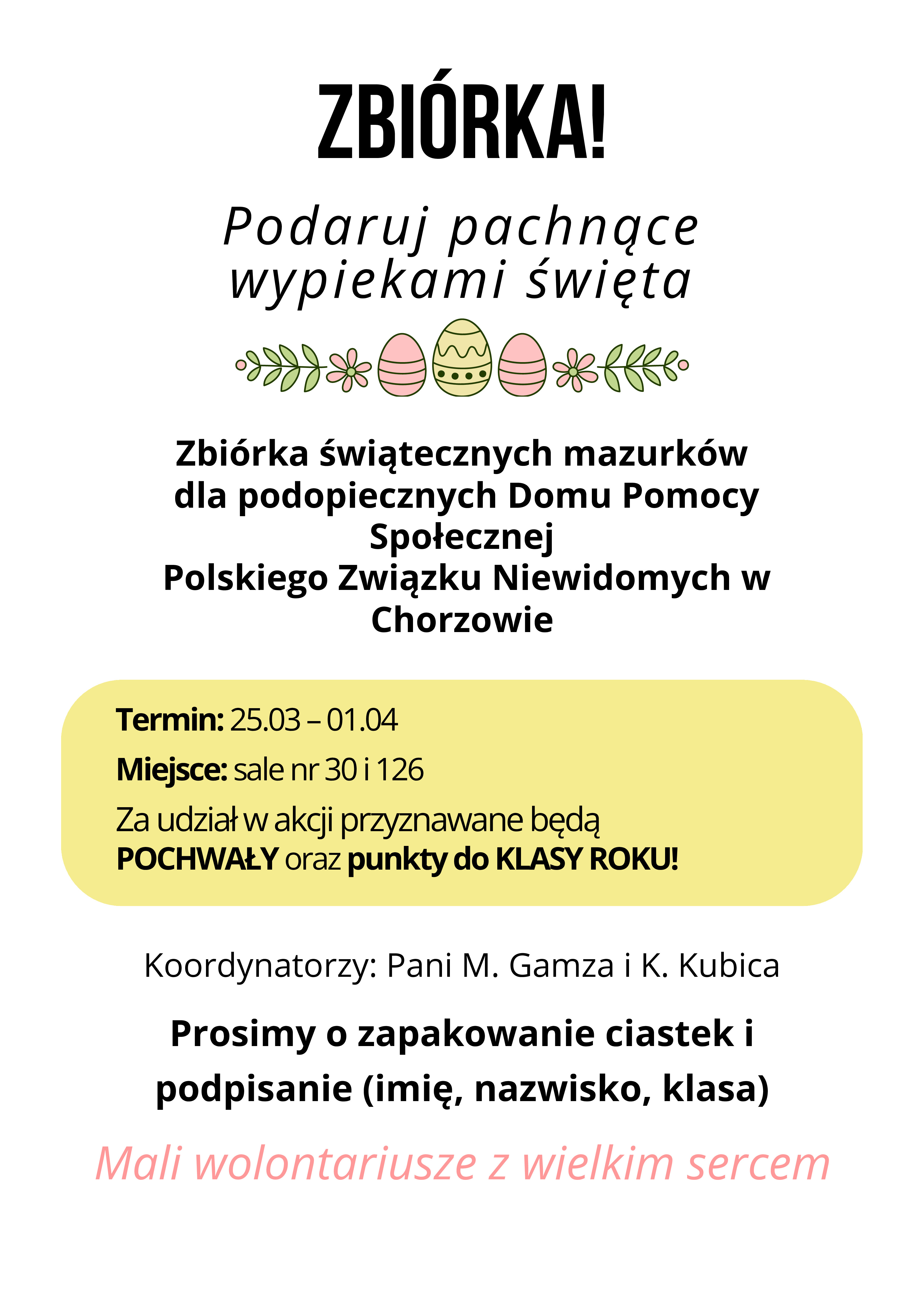Szkolna rada wolontariatu ogłasza ostatnią już w tym roku szkolnym zbiórkę: świątecznych mazurków i ciast dla Podopiecznych Domu Pomocy Społecznej Polskiego Związku Niewidomych w Chorzowie.