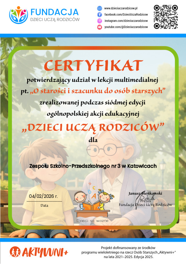 W ramach realizacji ogólnopolskiego programu edukacyjnego „Dzieci uczą rodziców” przeprowadzono zajęcia o tematyce „O starości i szacunku do osób starszych”. Celem zajęć było kształtowanie u uczniów postaw empatii, wrażliwości społecznej oraz szacunku wobec osób starszych, a także zwrócenie uwagi na rolę seniorów w życiu rodzinnym i społecznym.