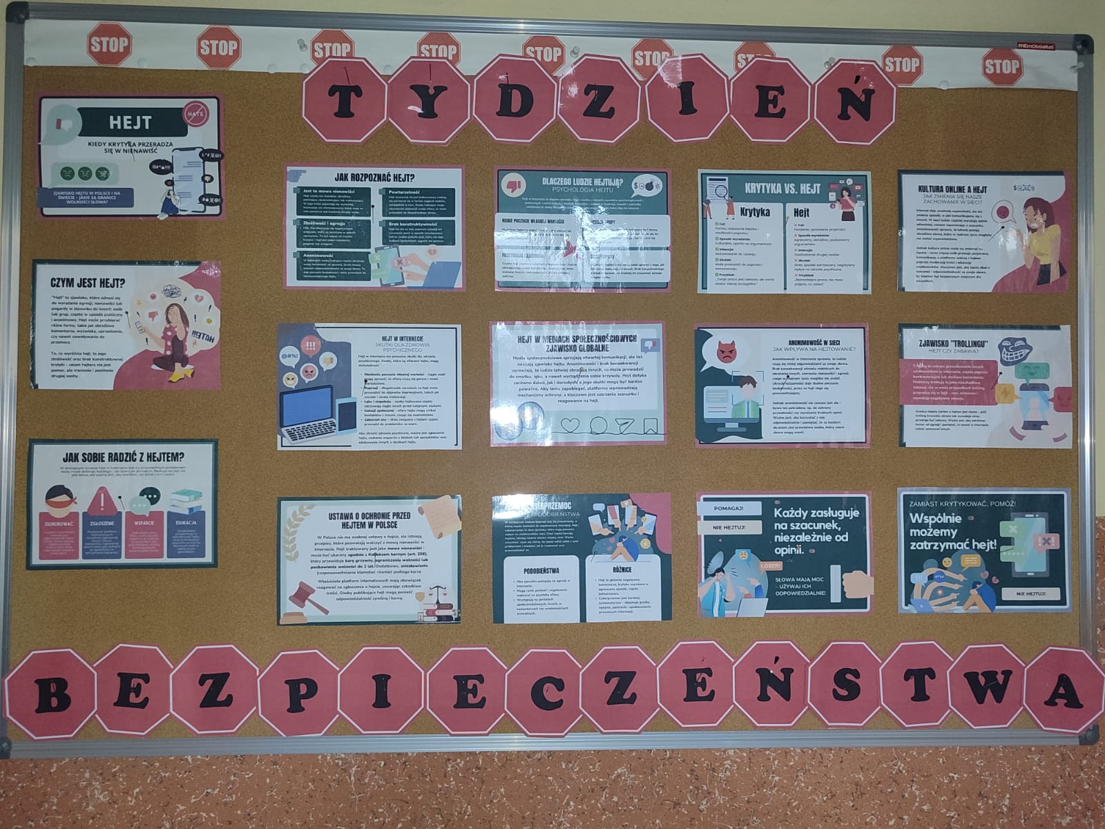 Już w poniedziałek uczniowie, nauczyciele i goście, przekraczając próg szkoły, mogli podziwiać galerię prac ukazujących zwycięstwo pozytywnych emocji i działań nad hejtem. Na korytarzach pojawiły się także ostrzegawcze zasady bezpieczeństwa dla dzieci w każdej dziedzinie życia. Tego dnia uczniowie klas I–III odwiedzili pobliską jednostkę Ochotniczej Straży Pożarnej Dąbrówka Mała w Katowicach, gdzie poznali specyfikę pracy strażaków oraz zasady reagowania w sytuacjach zagrożenia. Tematyka bezpieczeństwa była również obecna podczas lekcji wychowawczych. Przez cały tydzień nauczyciele świetlicy szkolnej organizowali quizzy i konkursy związane z bezpieczeństwem.