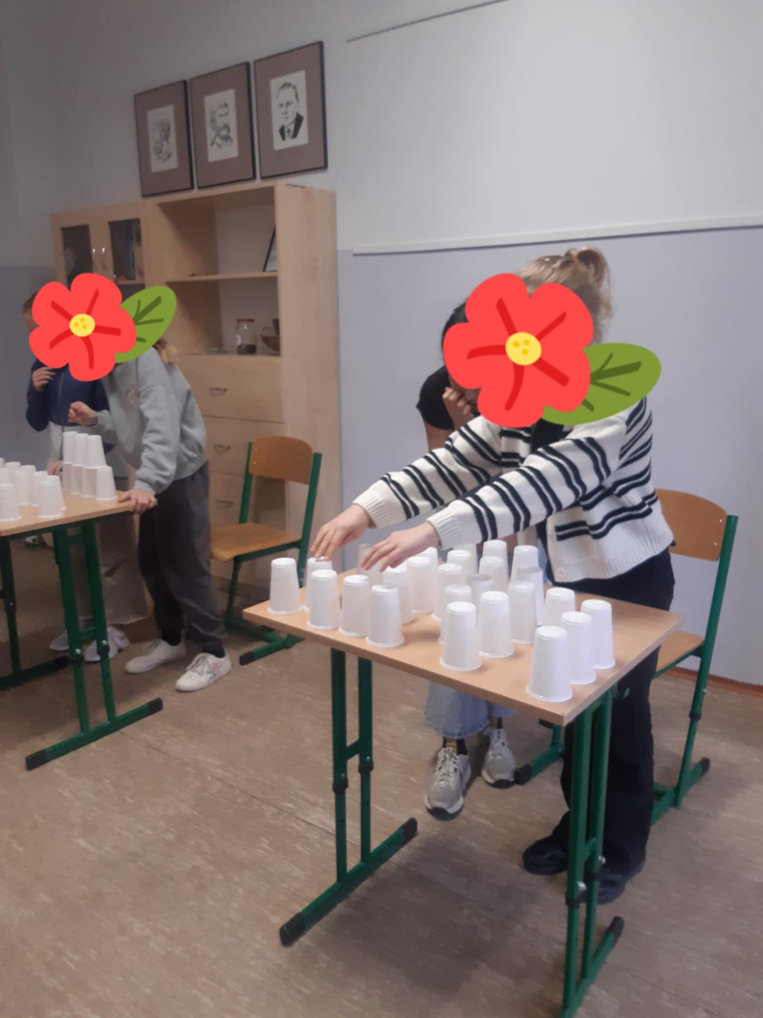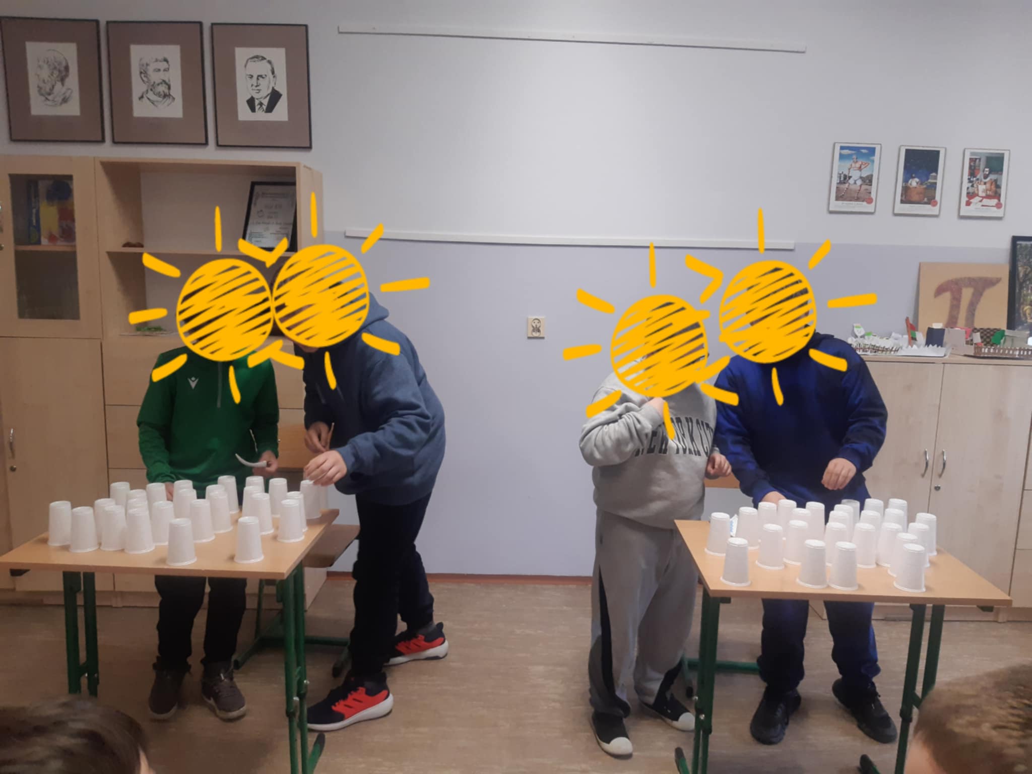 Uczniowie z zaangażowaniem brali udział w zabawach matematycznych — od odszyfrowywania wiadomości po budowanie wież z kubeczków według wyników tabliczki mnożenia. W salach panowała świetna atmosfera, a uczestnicy wykazali się pomysłowością, szybkością i sprytem. Największe emocje wzbudziły zadania na czas, w których liczyła się precyzja i refleks.